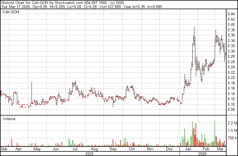 Technical Setup: GOH has pulled back ~24% from its March 1 high of $0.38, consolidating in the $0.28-$0.31 range on declining volume. This is a textbook cooldown after a 200%+ breakout from the $0.12 base that held from October through December. March 17 saw the heaviest sell volume (525K shares) with an intraday low of $0.27 that was immediately bought; followed by a volume low (127k) on March 17th, not seen since January 5th. This is a classic a shakeout candle. This kind of consolidation typically precedes a second leg higher when catalyst start hitting.