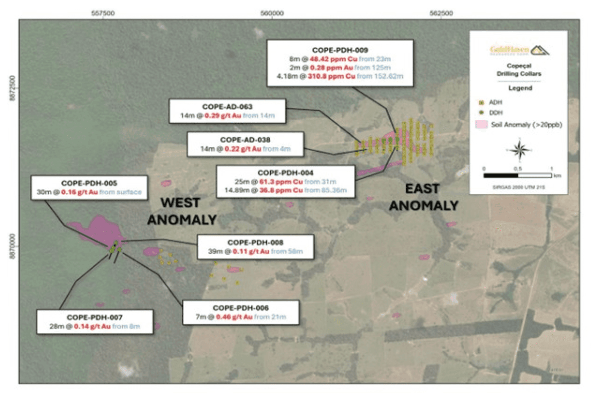 Today, GoldHaven released results from their maiden drill program at Copecal in Brazil. Nine holes completed across two targets.